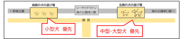 ※より安全にご利用いただくため、令和5年7月10日から、犬の体格差で2か所の施設を使い分けることといたしました。他の利用がない場合等には混在でもご利用いただけますが、引き続きマナーを守り、譲り合ってご利用ください。